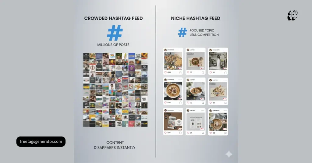 These hashtags have millions of posts added every hour. Your content disappears in seconds. Instagram also struggles to understand what your post is actually about.