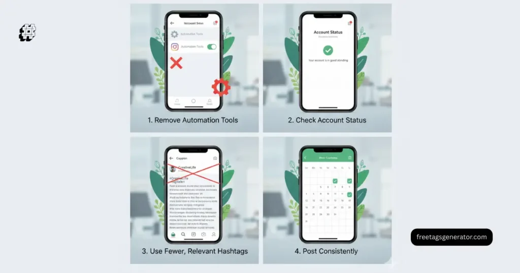 Stop risky behavior, clean hashtags, post consistently, and allow time for reset.