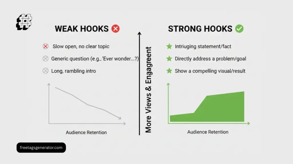 The first 2–3 seconds define context. If the hook is vague, TikTok cannot classify the video quickly.
